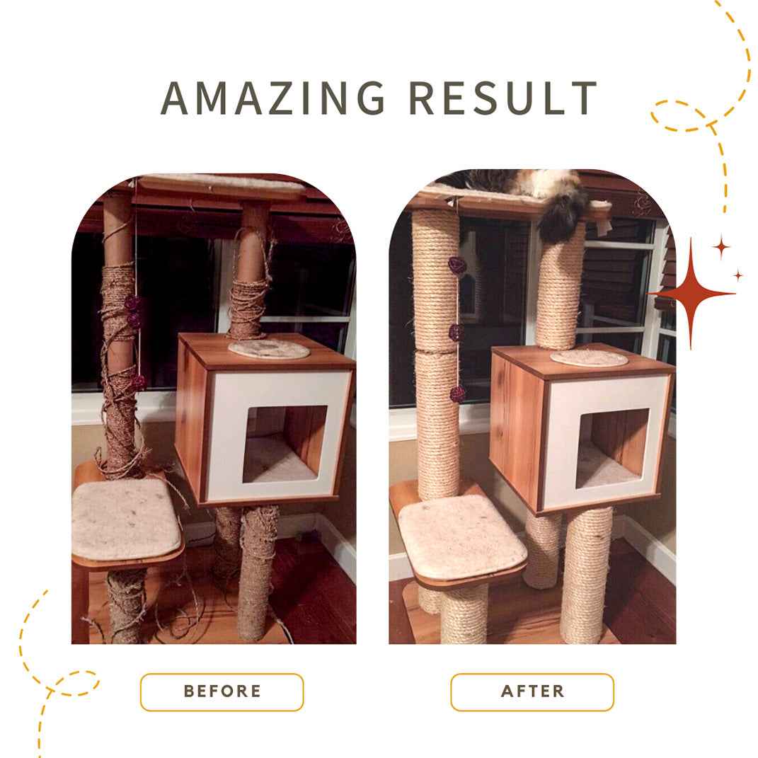 Our thicker 3/8 inch Brazilian sisal rope - wrapped & secured properly, and our solid wood core plugs transform a disposable design into a perch that can be passed on to the grandkittens.